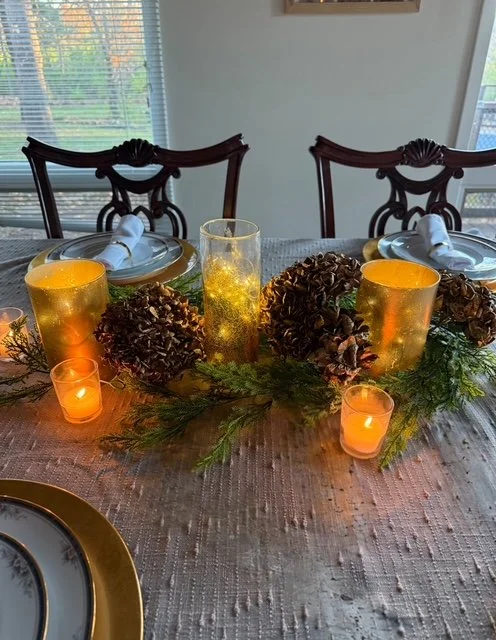 Since we’re usually away for the holidays, I’ve never invested much in a tablescape. I wanted something simple but beautiful without spending a lot, so I headed to Goodwill—and I couldn’t believe what I found. Brand new Bloomingdale’s gold chargers (tags still on!) marked $19.99 originally… I grabbed them for $1.99 each. I also found a few pretty gold vases for just 99 cents apiece.