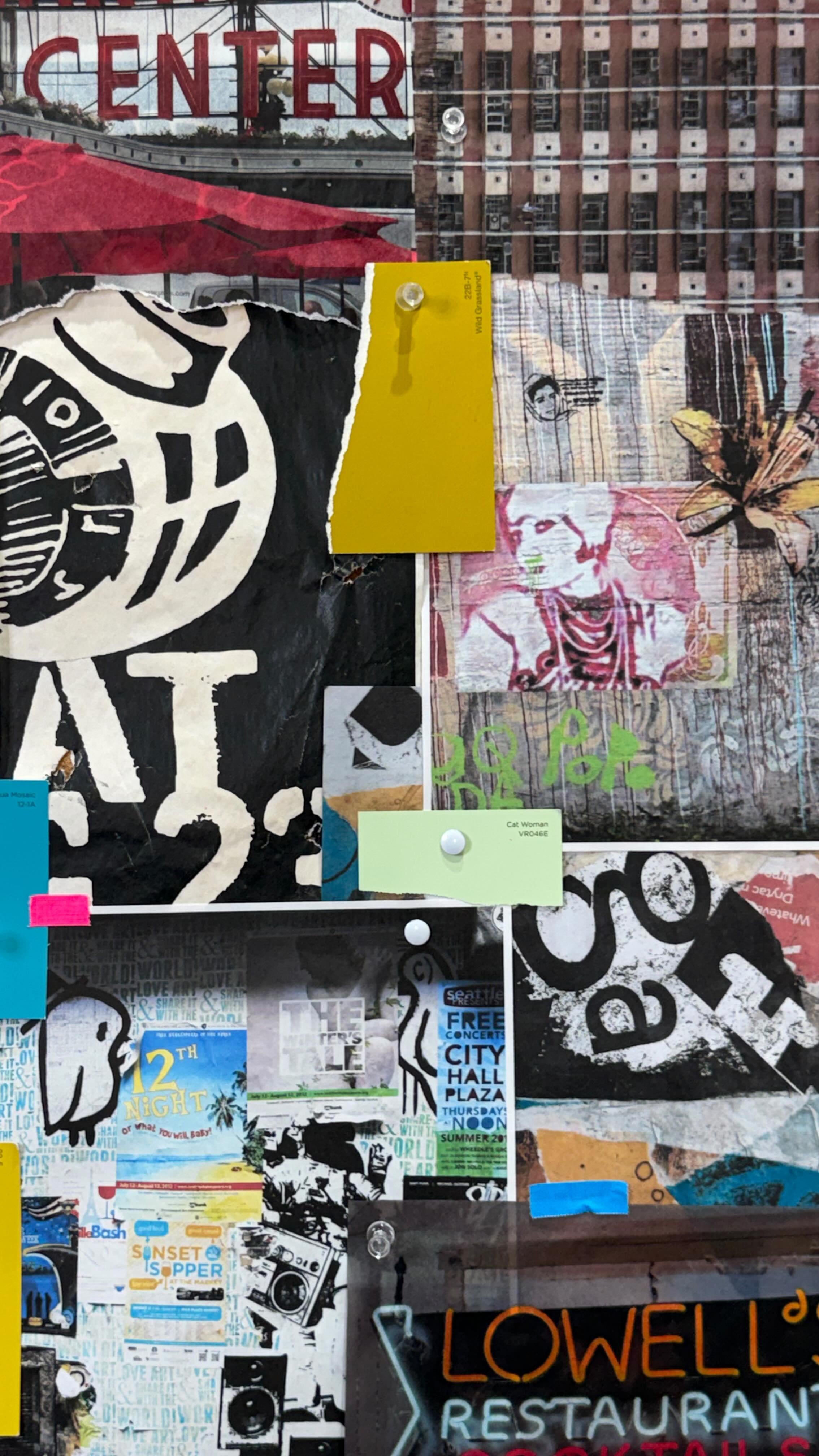 We layer our found elements using tracing paper, palette knife texture, and a carbon-traced floral for an urban, peeled-poster look.